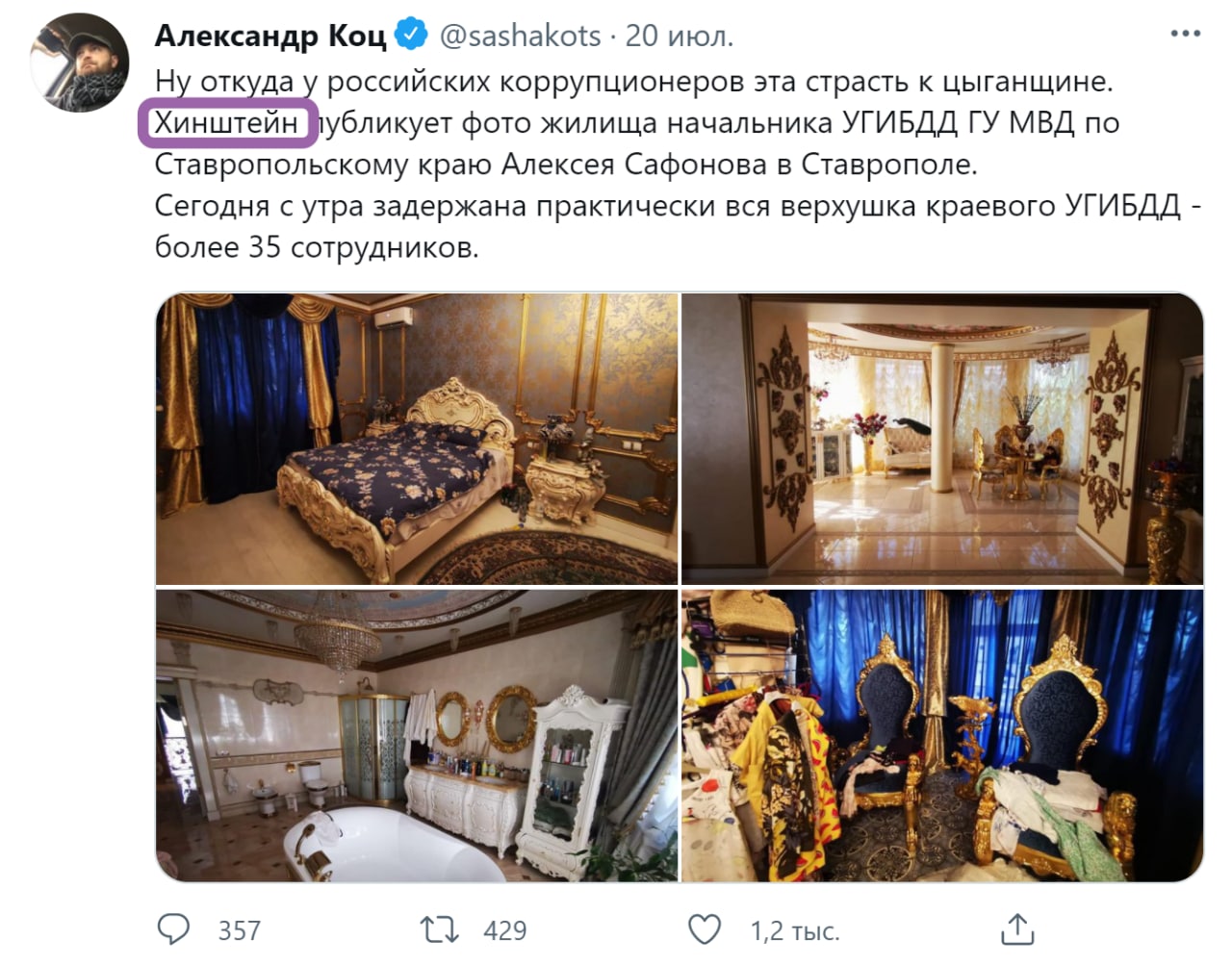Одну интересную мелочь упустили мы в деле о задержании начальника гаишников Ставрополья. Первым, кто разместил фотографии замечательного дома коррупционера был депутат Государственной Думы от Единой России по 158 округу от Самарской области Александр Хинштейн. Больше вопросов, чем ответов. Почему именно он размещает результаты совместной операции МВД и Росгвардии, какое отношение самарский депутат имеет к Ставрополью и почему вообще съёмка попала к депутату ГД, а не в сводки МВД. Всё просто, выборы на носу и надо набирать баллы.