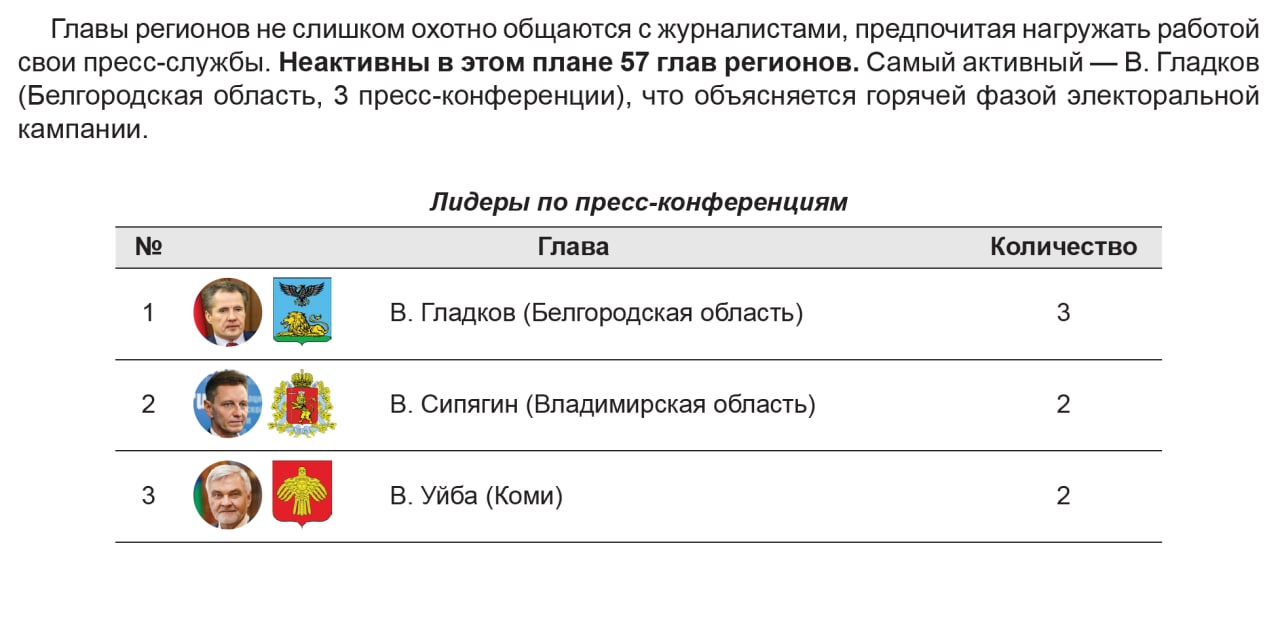 Но у нашего Главы есть и позитив. Владимир Уйба в лидерах по проведению пресс-конференций, НЕЗЫГАРЬ насчитал их целых ДВЕ...