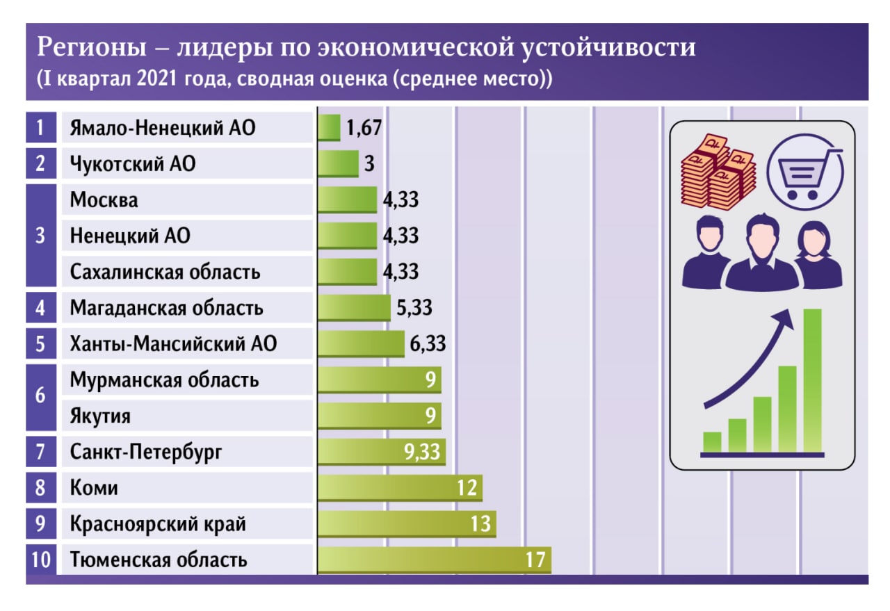 Лидером стал Ямало-Ненецкий автономный округ. Уверенное второе место заняла Чукотка. А вот третье поделили сразу три региона: Москва, НАО и Сахалинская область. Также в первую десятку вошли Магаданская область, ХМАО, Мурманская область и Якутия (раздели шестое место), Санкт-Петербург, Коми, Красноярский край и Тюменская область.