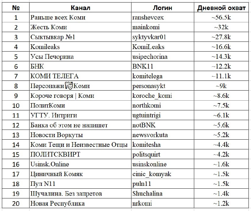 Дневной охват — суммарное количество просмотров всех публикаций канала за сутки (при расчете также не учитываются репосты). Идея этого рейтинга до боли проста, берём дневной охват всех telegram-каналов на Коми поляне и выстраиваем их по рейтингу. На этой неделе немного сменим формат, но зато улучшим визуал. Строгая табличка с данными.