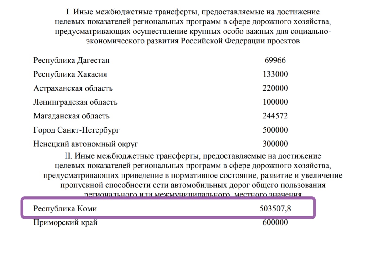 Республика Коми получит 503 507 тысяч рублей из федерального бюджета на приведение в нормативное состояние, развитие сети автодорог регионального или межмуниципального, местного значенияю