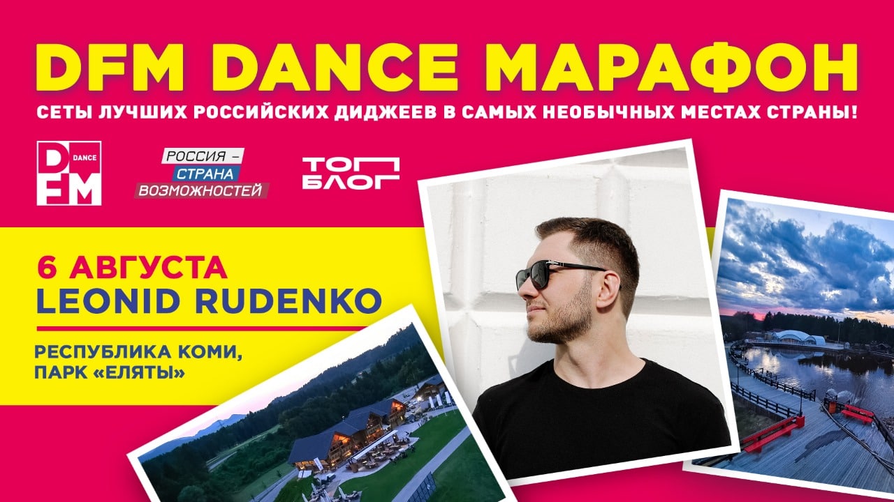 Как нам стало известно Леонид Руденко сыграет DJ-сет в парке «Еляты». 6 августа в 19:00 состоится третий танцевальный DJ-сет в рамках марафона DFM Dance.