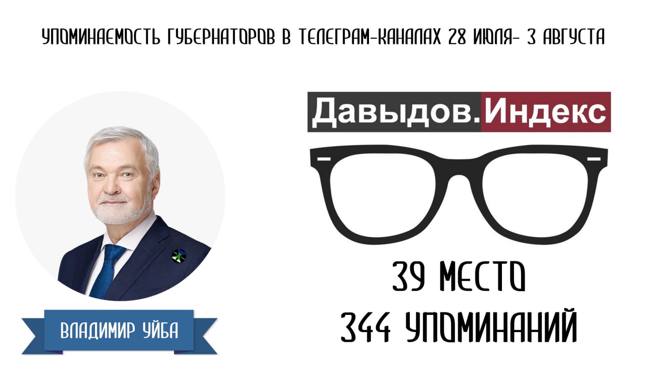 Фонд «Петербургская политика» и экспертная сеть «Давыдов.Индекс» составили рейтинг упоминаемости губернаторов в телеграм-каналах 28 июля – 3 августа 2021 года. За этот период Владимир Уйба опять упал относительно своих коллег на два пункта. Если неделей ранее он был на 37 месте, то за прошедший отчётный период количество упоминаний настолько мало, что хватило только на 39 место.