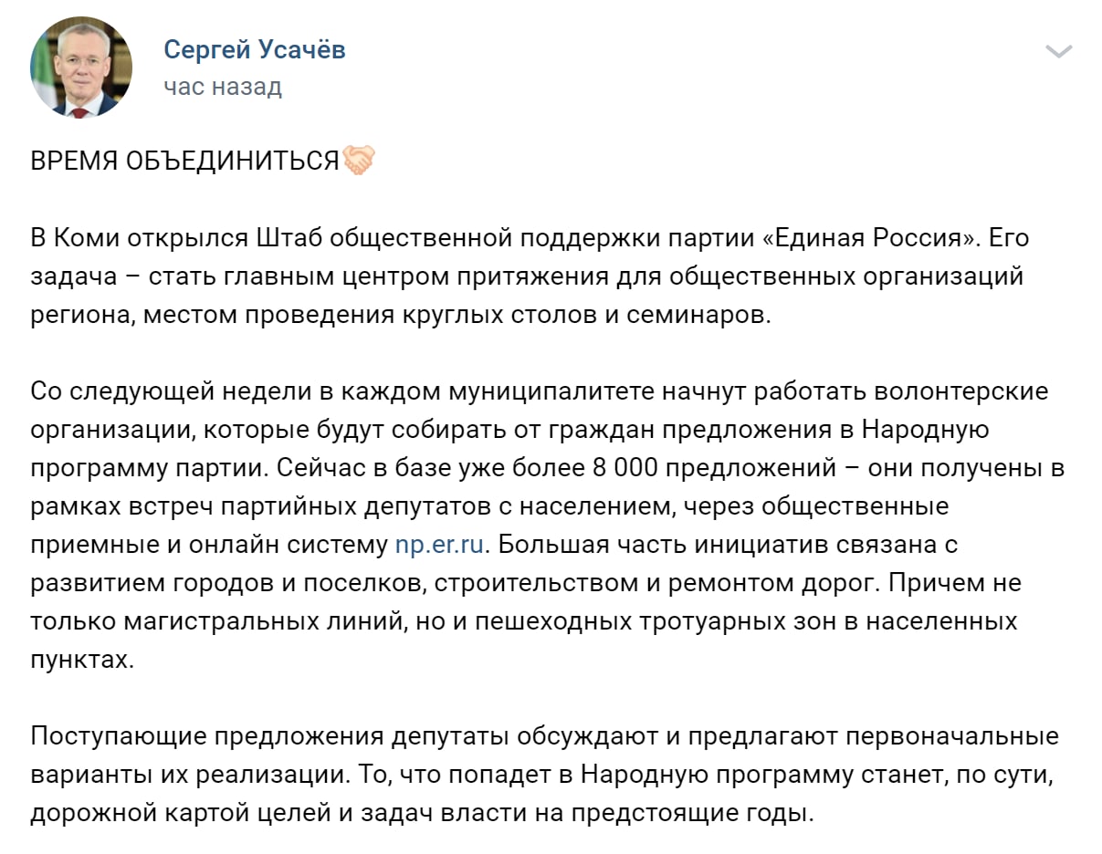 Итак, Усачёв сообщает, что в Коми открылся Штаб общественной поддержки партии «Единая Россия». Вот только это какой-то каламбур, так как общественной поддержки партии быть не может. То есть политики в один момент собрались и выступили против общественности - повышение пенсионного возраста, налог для богатых (НДФЛ свыше 5 млн), повышение НДС, отмена налоговых льгот для вязкой нефти, закон о валежнике - всё это плевок в лицо общественности.