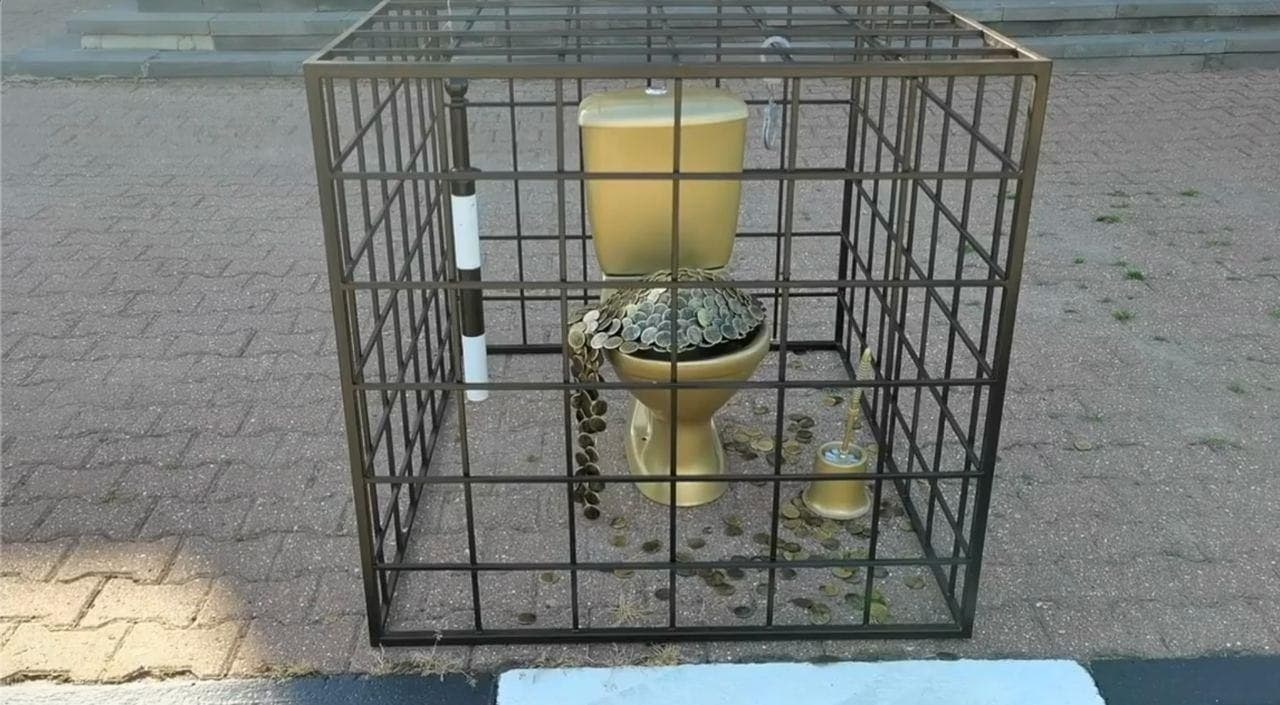 Мужчина не просто повторил золотой унитаз из дома главы местного ГИБДД, а наполнил его деньгами и заключил в клетку. Так он хотел напомнить сотрудникам, что любая взятка окончится тюрьмой. Но благородный порыв теперь грозит тюрьмой для самого художника