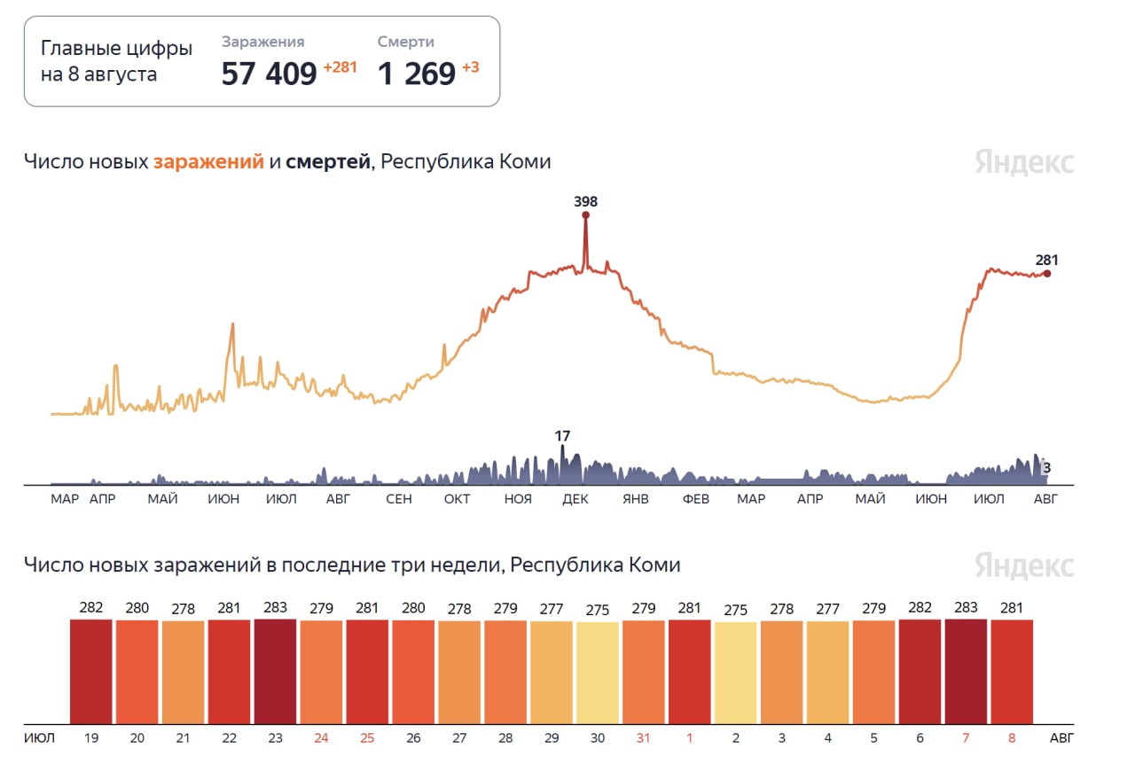 Республика Коми в этом рейтинге находится на 73 месте с показателем 111%. Первое место занимает Республика Ингушетия - 144,1%, а последнее место у Еврейской автономной области 97,3%. К слову, меньше ста показатели только у трёх регионов, в 82 субъектах смертность выросла значительно.