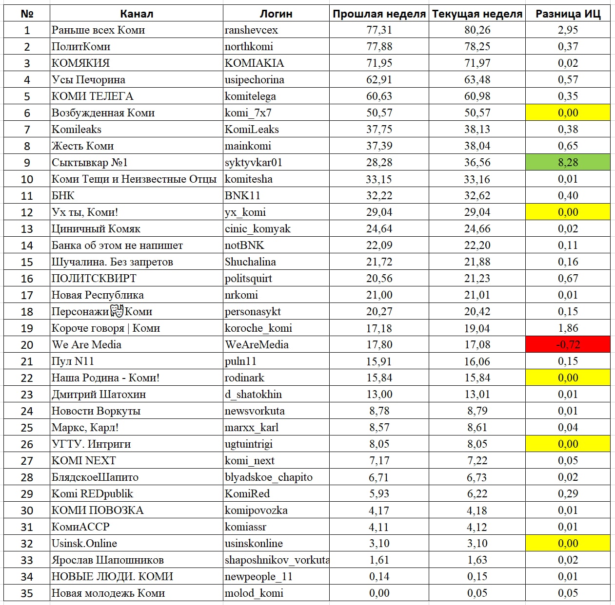 Сегодня поговорим об индексе цитирования. Индекс цитирования — показатель авторитетности Telegram-канала, рассчитанный на основе упоминаний канала, а также репостов и упоминаний публикаций канала в других Telegram-каналах. То есть, чем чаще вы видите ссылку на другой источник, тем больше ИЦ он получает. На прошлой неделе мы сбили все каналы на коми-поляне в одну таблицу и раз в неделю будем генерировать с помощью неё контент. Если ваш ИЦ падает или слабо растёт, надо писать что-то более интересное, чтобы вас чаще упоминали.