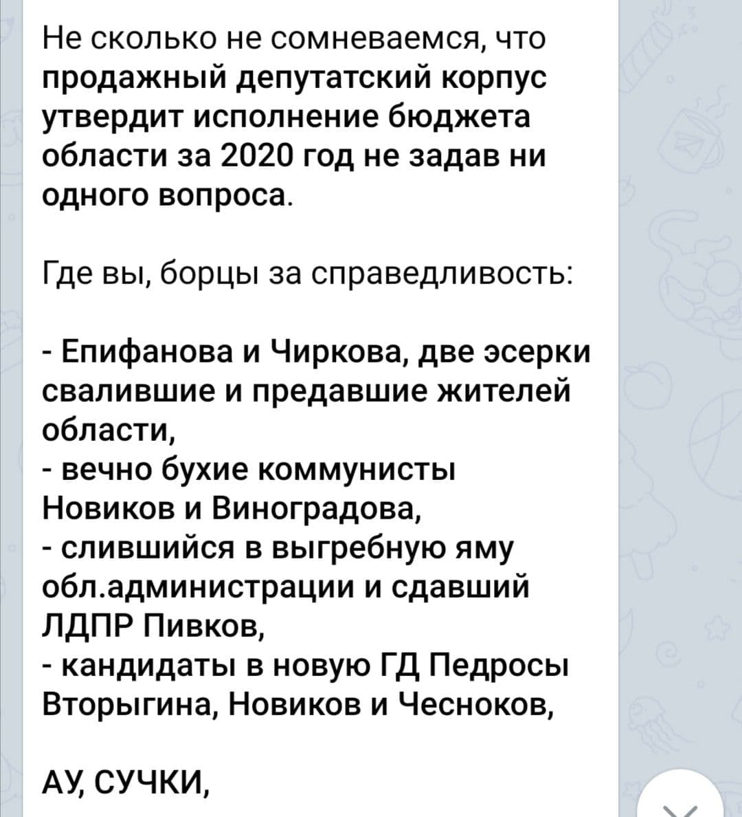 В итоге за Киселёва проголосовали 15 народных избранников, за Корягину - один депутат. Ещё два бюллетеня были испорчены.