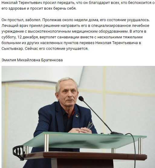Лидер «Изьватас», депутат Госсовета Коми Николай Братенков в ответ на критику, что за ним лично отправили борт санавиации✈️ в своем основном информационном рупоре🗣 - в группе в ВК "Миян Ижма" вынужден оправдываться. Вертолет по его версии перевозил нескольких больных🤧, а не его одного.