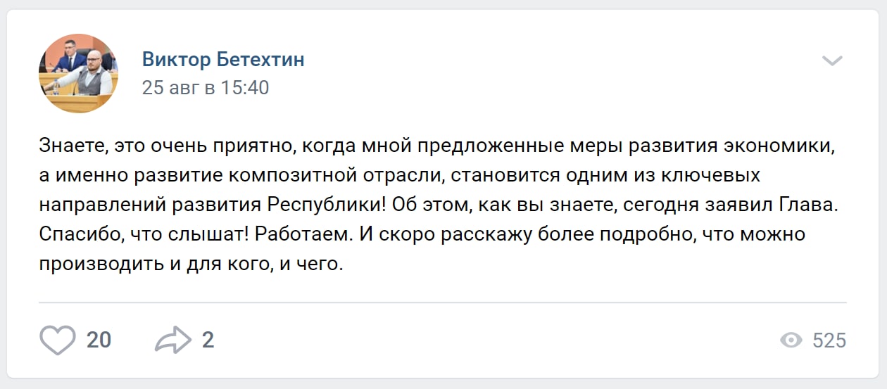 Депутат Госсовета Виктор Бетехтин на полном серьёзе думает, что его страницу в ВК читает Глава Республики Коми Владимир Уйба и прислушивается к тому, что там написано. Особенно важно отметить, что предложенные Витей решения легли в основу инвестиционного послания руководителя региона.