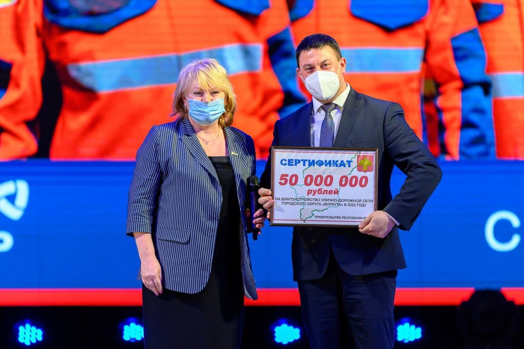 А вчера, напомним, Воркута получила 50 млн рублей от Правительства Коми на благоустройство. В этот знаменательный день Воркута получила от Правительства Республики Коми сертификат на 50 миллионов рублей, которые будут направлены на благоустройство муниципального образования. Сертификат мэру Воркуты Ярославу Шапошникову вручила вице-премьер регионального Правительства Галина Габушева.