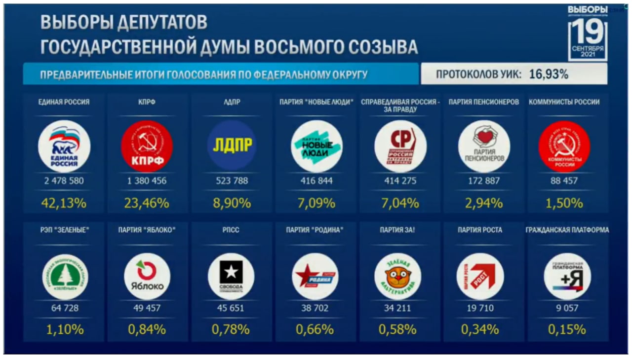 По России. Обработано почти 15% протоколов, предварительные итоги такие: