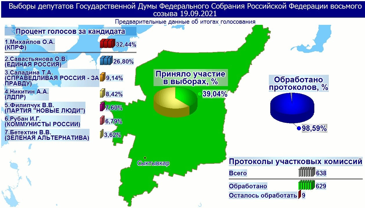 По данным Сыктывкарской городской избирательной комиссии, по единому федеральному округу явка избирателей на выборы депутатов Госдумы РФ составила 40,59%.
