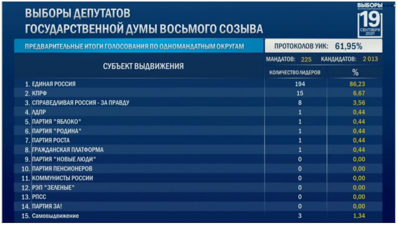 По итогам обработки 99,72% протоколов "Единая Россия" получает на выборах 49,84% голосов. Представители партии одерживают победу в 198 одномандатных округах. На выборах депутатов Госдумы в 2016 году "Единая Россия" получила 54,19% голосов избирателей (в общей сложности партия получила 343 мандата депутатов с учетом победы одномандатников в своих округах).