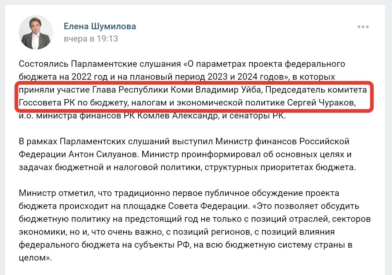 Можно предположить, что Елена Борисовна с 19 по 22 сентября не успела запомнить как кого зовут, да оно ей и не надо было. Ещё до избрания в Государственный Совет она уже знала, что попадёт в Совет Федерации и станет сенатором от Коми. Но скорее всего Елена Шумилова не пишет свои посты сама, для такого у неё есть помощник, который, вероятно, не знает поимённо всех депутатов заксобрания Коми. Но в любом случае мы считаем это позором, а не простительной опечаткой, так как публичный человек такого уровня не должен опускаться до того, чтобы не знать как зовут регионального депутата, да ещё и члена президиума.