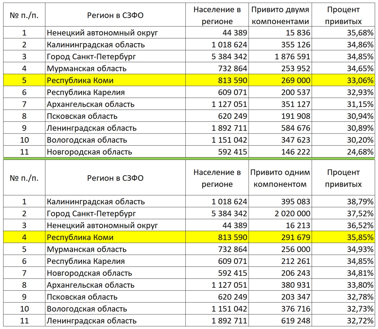 Сегодня Владимира Уйбу упрекают в том, что темпы вакцинации низкие. Да, оно так и есть. Но тем не менее по количеству вакцинированного населения, заметим не в числовом выражении, а в процентах, Республика Коми занимает пятое место в СЗФО среди тех, кто сделал обе прививки, а месяцем ранее это было третье место. И четвёртое место среди тех, кто сделал пока что одну прививку.