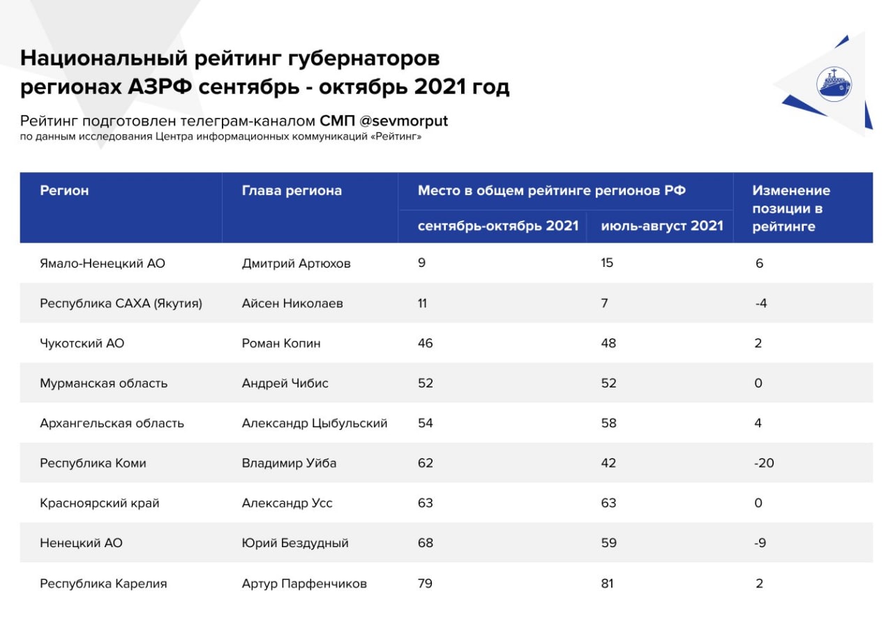 Остальные главы северных регионов входят в группу середнячков либо аутсайдеров. Так, следующий за Артюховым и Николаевым Роман Копин (Чукотка) занял только 46-е место. Это чуть лучше, чем было по итогам лета. К прослойке середняков можно отнести Андрея Чибиса (Мурманская область) и Александра Цыбульского (Архангельская область). Последний при этом сумел немного улучшить свое положение в рейтинге.