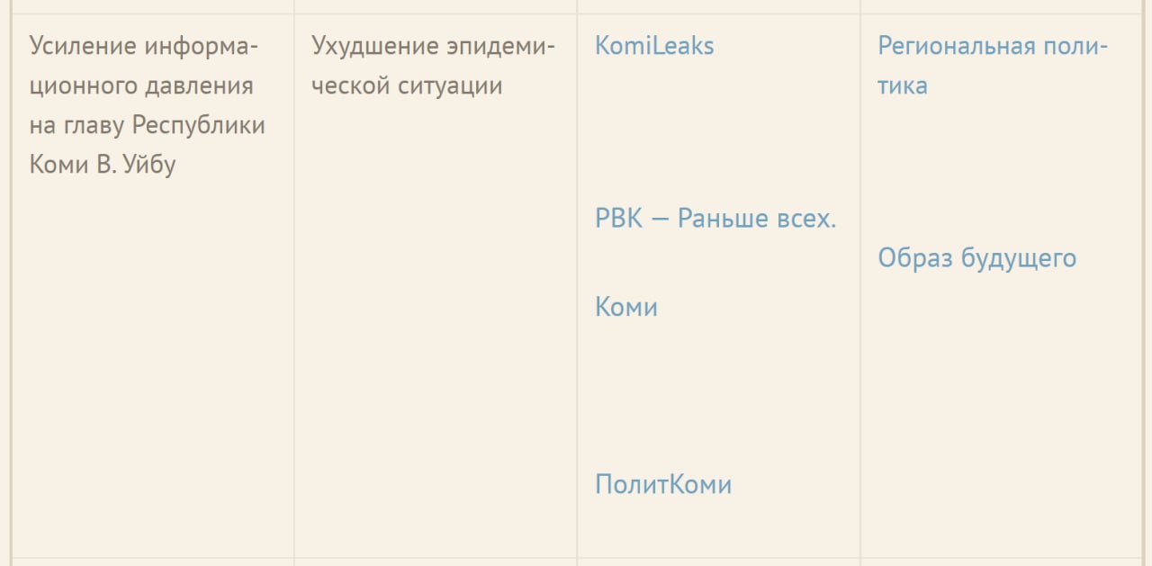 Девятое место занимает кампания, связанная с усилением информационного давления на главу Республики Коми Владимира Уйбу. Атака на Уйбу осуществляется с привязкой к негативной динамике развития эпидемической ситуации в регионе. Ряд каналов, например, KomiLeaks, делая отсылку к контексту прихода Уйбы в регион, выражают сомнения по поводу его профессиональных навыков. Канал РВК — Раньше всех. Коми критикует пиар-стратегию губернатора в контексте напряженной эпидситуации и ряда других внутрирегиональных проблем, указывая, что она негативно сказывается на и без того слабом имидже Уйбы: “Желание пиар-менеджеров Желтого дома очеловечить образ губернатора понятно, но сама картинка старенького чиновника, собирающего Lego, диссонирует с антилидерством Коми в ковидной статистике, коммунальной катастрофой Вуктыла, массовым убийством бродячих собак и разорением “Комиавиатранса”. Канал ПолитКоми указывает на стремительное падение рейтинга Уйбы и предсказывает скорый кризис его имиджа. Канал Региональная политика подчеркивает наличие конфронтации между элитами региона и отмечает неустойчивые позиции Уйбы. Аналогичного мнения придерживается канал Образ будущего, указывая на прежние неоднозначные действия Уйбы: “В Коми у Уйбы серьёзный политический кризис. Против него вся местная элита. Сам он, видимо, горько пьёт, что видно по августовской перепалке с Турчаком, которая произошла на глазах у всех регионов, которые участвовали в ВКС, организованной Кириенко”.