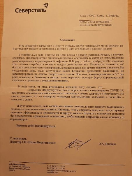 Листаем Воркутинский блокнот и видим письмо от руководства шахты семье шахтёра, который так и не привился до сих пор. Это же каким надо быть человеком, чтобы пойти на такие меры?