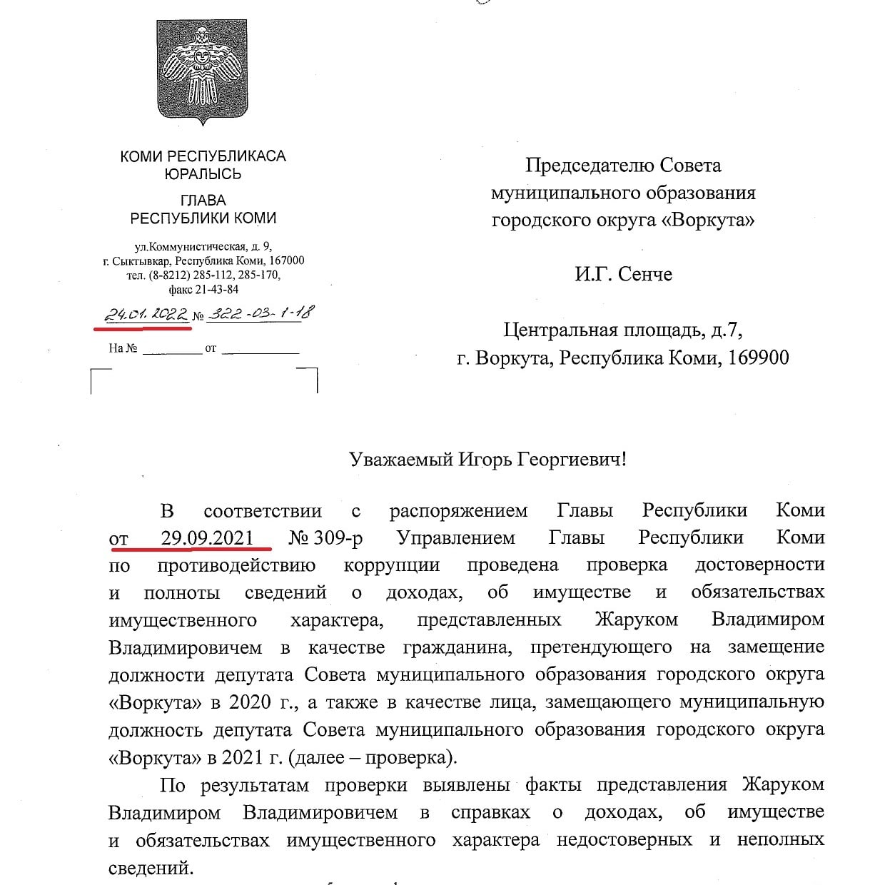 Владимир Жарук пишет: "Вчера получил на почте заказное письмо от председателя горсовета Сенчи с приложениями (2 страницы сопроводиловки + 8 страниц доклада о результатах проверки) за подписью Главы Республики Коми Уйбы о досрочном прекращении депутатских полномочий".