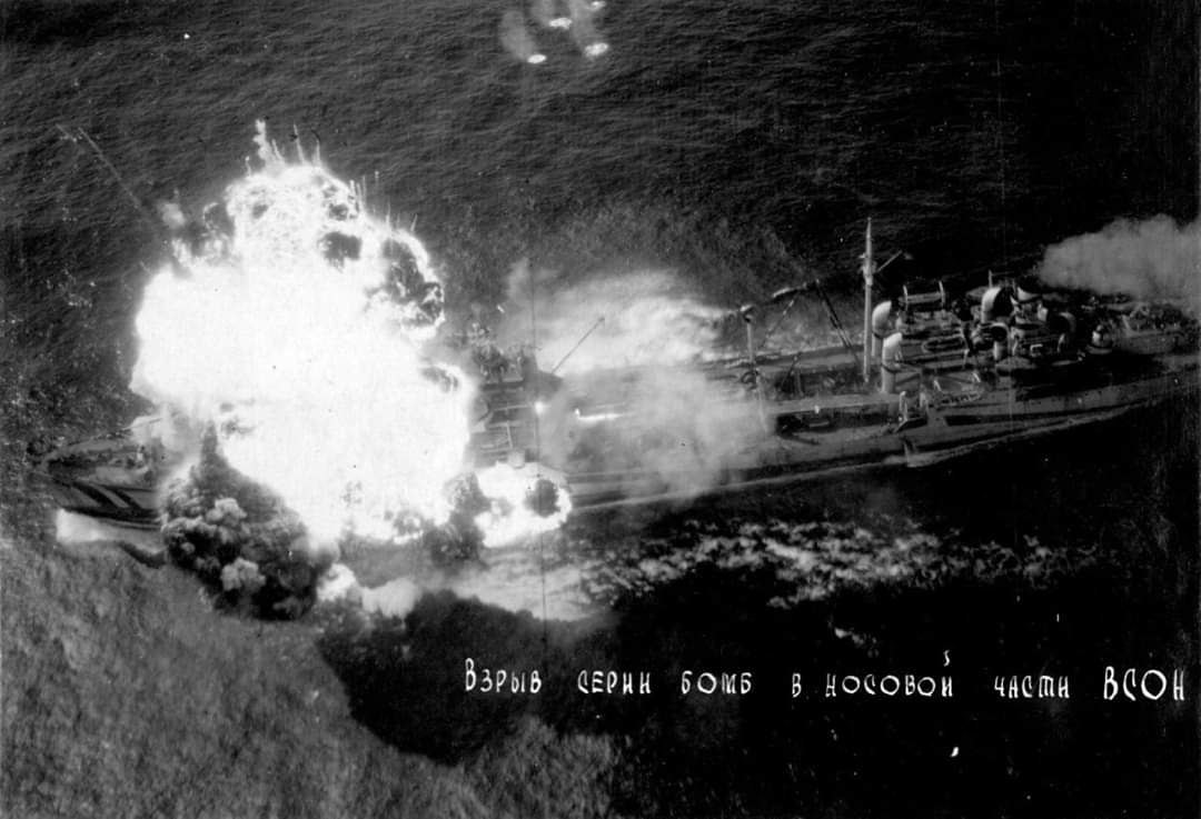 Фотографий работы топмачтовиков много, но это фото, на мой взгляд, одно из самых эффектных. 8 апреля 1945 года, Ил-2 атакуют немецкое вспомогательное судно снабжения «Франкен» (Trossschiff «Franken»). Белые всплески в верхней части снимка – места рикошета бомб ФАБ-100 от воды при топмачтовом бомбометании. Попали в корабль все четыре или нет, точно неизвестно, но «Франкену» хватило -- судно разломилось на две части и затонуло.