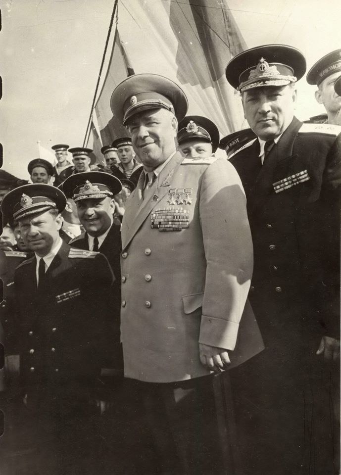 15.10.1955 г. Министр обороны Г.К. Жуков на борту крейсера "Адмирал Нахимов" пришедшего из Николаева после окончания модернизации по пр. 67ЭП в крейсер УРО. Справа от него ком. ЧФ В.А. Пархоменко. Слева командир крейсера Л.Д. Чулков. Между Жуковым и Чулковым ЧВС ЧФ Н.М. Кулаков. Фото из личного архива вице-адмирала Л.Д. Чулкова.
