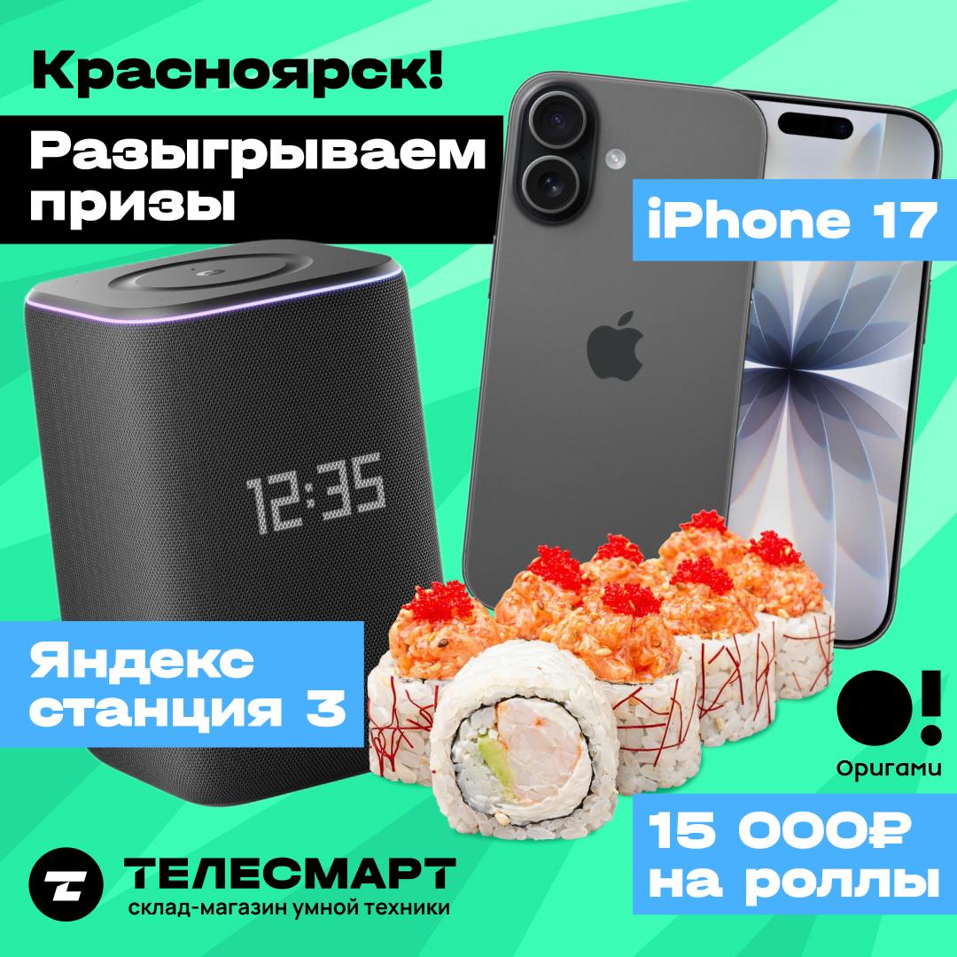 📱Красноярск, разыгрываем новенький iPhone 17, Яндекс Станцию 3 и 15 000 рублей на роллы!