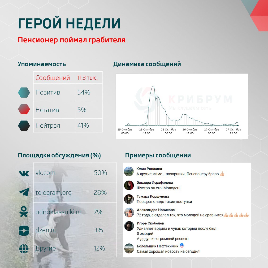 Всего история с поимкой грабителя была упомянута более одиннадцати тысяч раз почти за три дня. Тональность упоминаний в соцсетях поделилась на 54% позитивных, 5% негативных и 41% нейтральных комментариев. Многие пользователи восхитились поступком пенсионера, а также порадовались новости о вознаграждении героя. Авторы комментариев отметили, что такие поступки обязательно должны достойно поощряться. Комментаторы также обсудили и раскритиковали прошедших мимо инцидента прохожих, подчеркнув, почему необходимо именно поощрять неравнодушие и человечность в обществе.