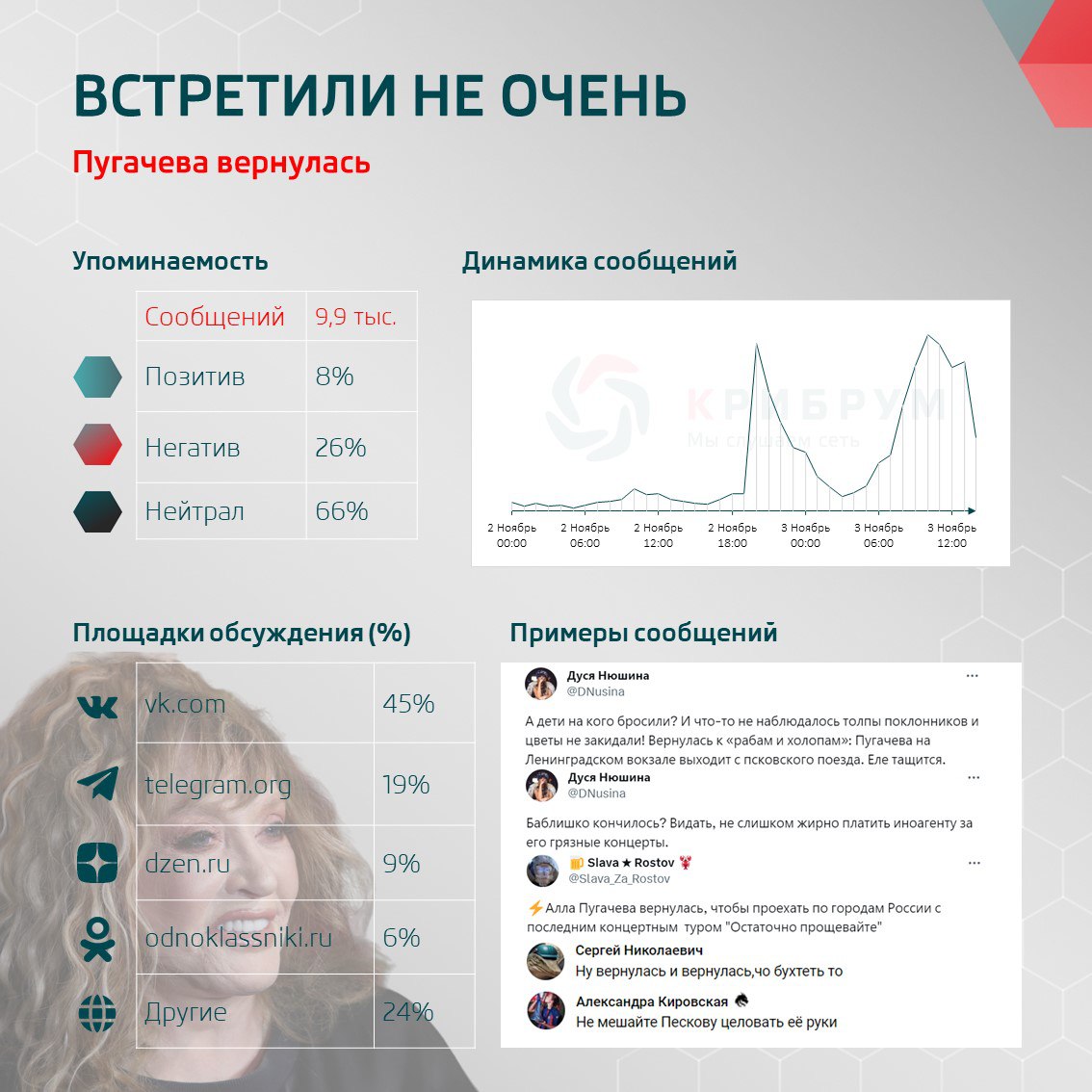 В Сети за пару дней было опубликовано почти десять тысяч сообщений о приезде Пугачевой. Тональность комментариев в соцсетях разделилась на 8% позитивных, 26% негативных и 66% нейтральных публикаций.
