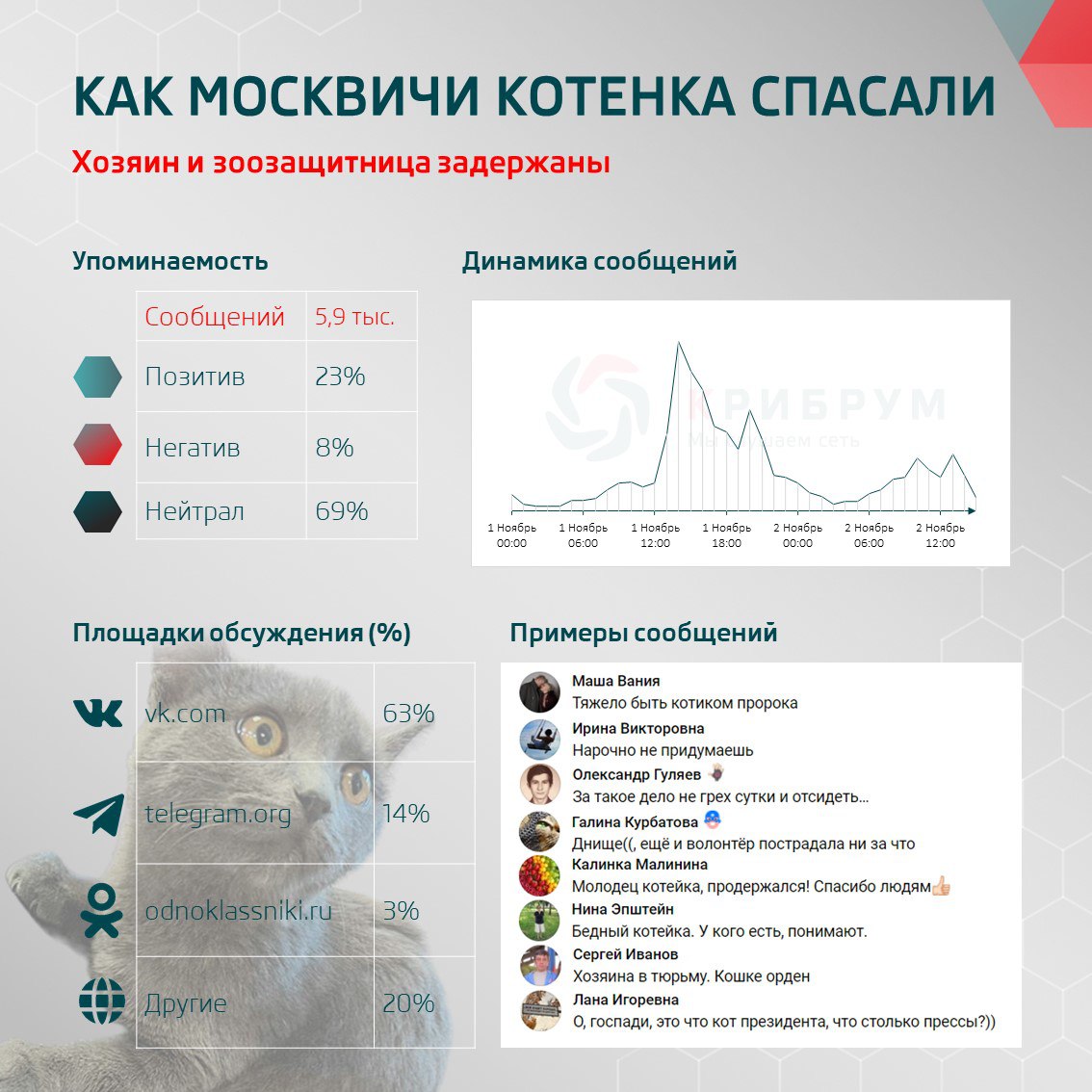 Всего в Сети история о спасенной кошке была упомянута почти шесть тысяч раз. Комментарии пользователей соцсетей разделились на 23% позитивных, 8% негативных и 69% нейтральных публикаций. Комментаторы удивились, как много внимания привлекла к себе обычная кошка, о которой уже второй день пишут журналисты. Также авторы заметили, что обычная история спасения обернулась большим количеством экшена.