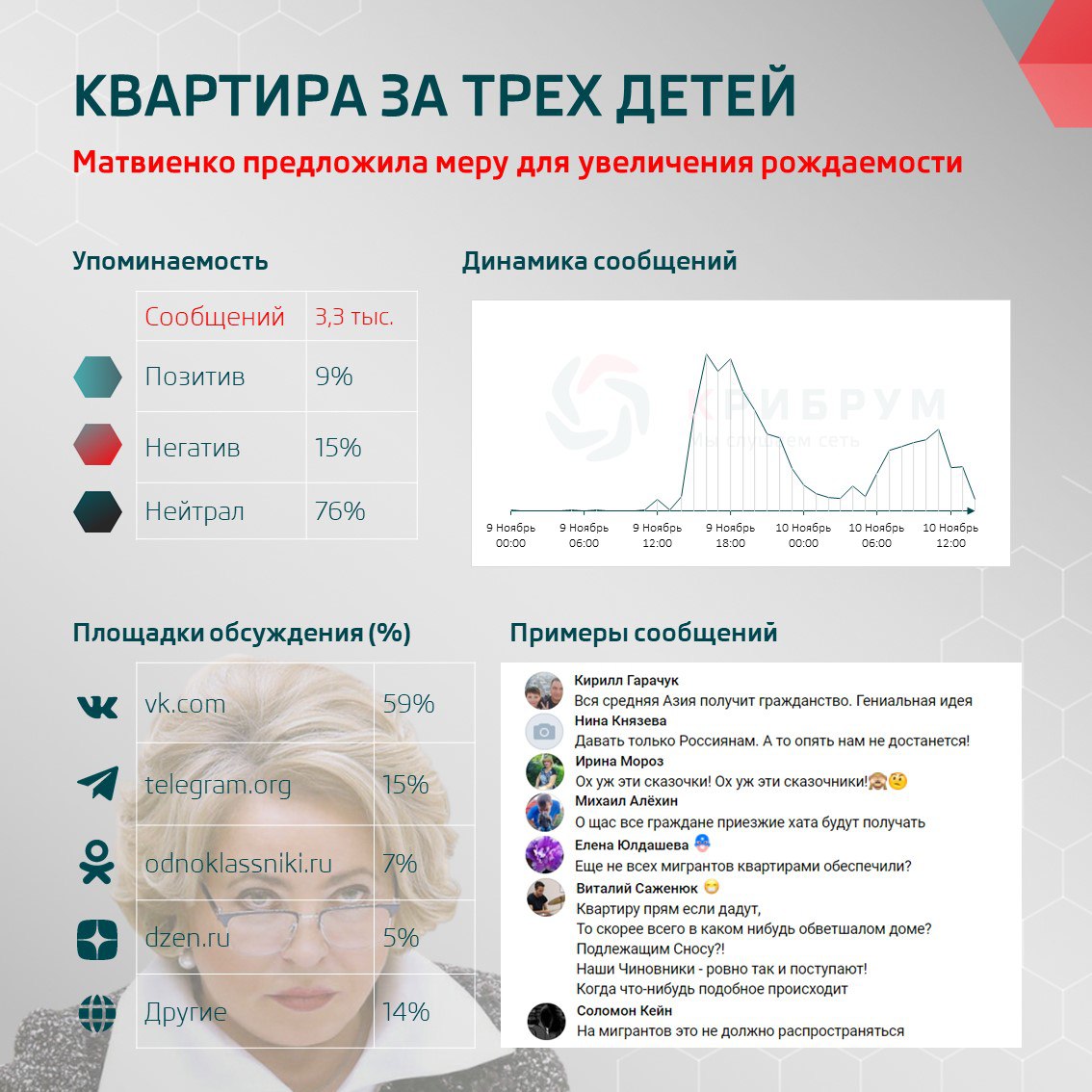 Предложение Матвиенко за пару дней было упомянуто более трех тысяч раз в Сети. Тональность комментариев в соцсетях поделилась на 9% позитивных, 15% негативных и 76% нейтральных сообщений.