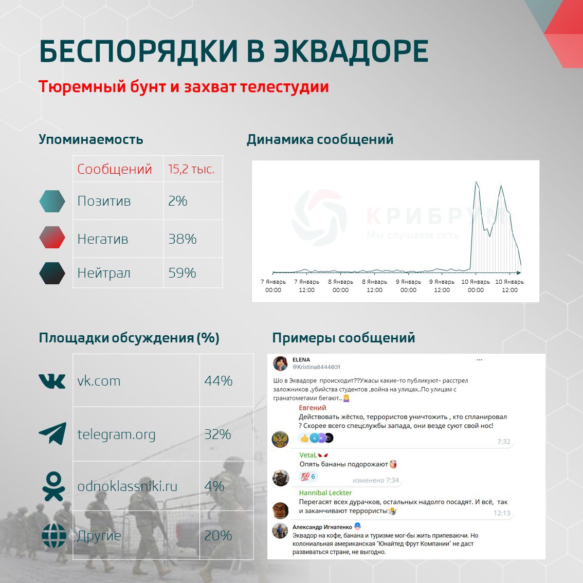 Русскоязычный сегмент Сети активно включился в обсуждение ситуации в Эквадоре - опубликовано более 15 тысяч сообщений. Пик активности пришелся на 10 января, когда в Эквадоре уже был введен режим ЧП. Комментарии в соцсетях разделились на 2% позитивных, 38% негативных и 59% нейтральных.