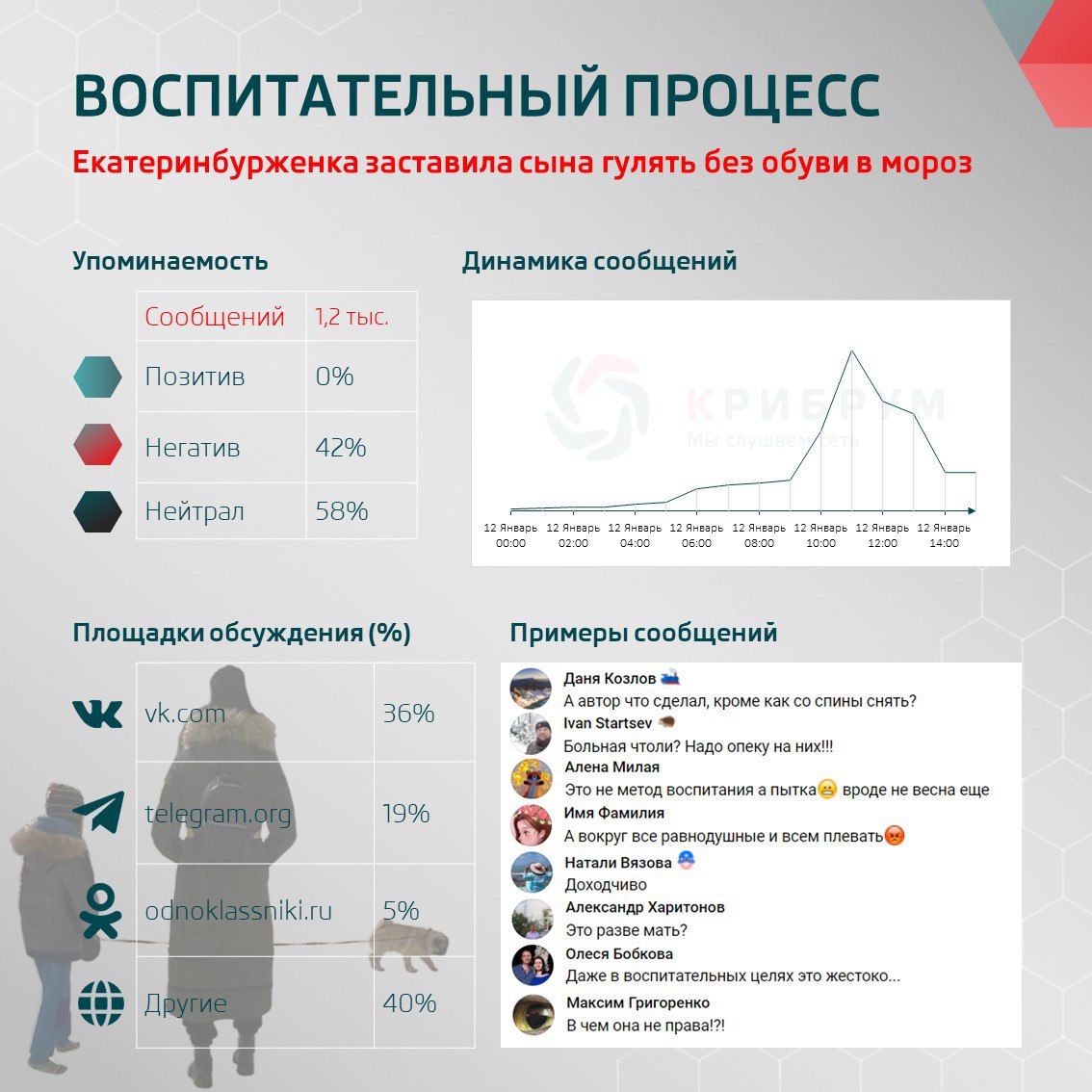 В Екатеринбурге прохожие заметили, как ребенок в сопровождении матери идет по морозу в одних носках. Женщина ругала ребенка за то, что он долго гулял с собакой, и у нее замерзли лапы. По словам очевидцев, мальчик плакал и кричал, что у него «отпадут ноги», а мать отвечала: «Нет, просто заболеешь». Прогулку с питомцем она заставила продолжить, но после полукруга у дома все же отправила ребенка домой.