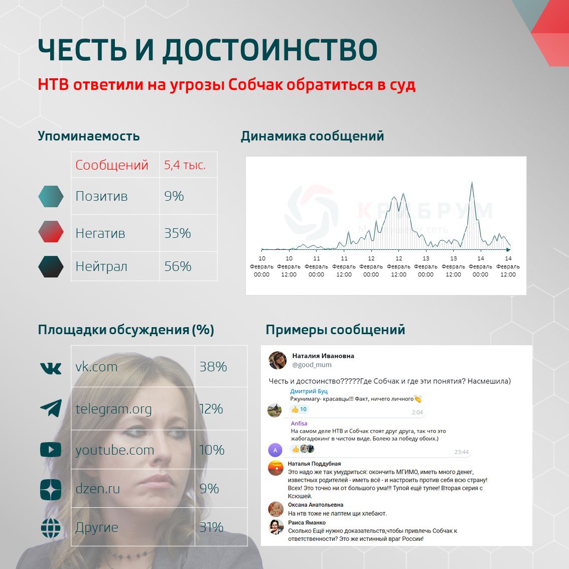 Затем Собчак обвинила телеканал в «воровстве ее материалов» и заявила, что подаст на телеканал в суд по статье о клевете и защите чести и достоинства. В редакции НТВ ответили на ее заявление: «Мы в свою очередь настаиваем на том, чтобы в случае обращения в суд Ксения приложила к пакету документов результаты экспертизы о наличии у истицы чести и достоинства», – говорится в сообщении.