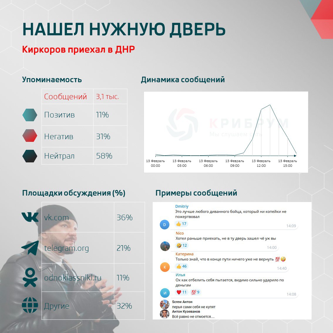 За несколько часов о приезде Киркорова в ДНР было сделано более трех тысяч сообщений. Тональность публикаций в соцсетях поделилась на 11% позитивных, 31% негативных и 58% нейтральных. Многие авторы комментариев выразили сомнения по воду искренности желания Киркорова помочь солдатам. Пользователи отметили, что до вечеринки, где пострадала его репутация, певец не спешил совершать гуманитарные миссии. Авторы таких комментариев призвали не спешить его прощать, чтобы артист почаще приезжал с гуманитаркой и подольше занимался добрыми делами. Впрочем, немало пользователей посчитали, что хорошие поступки нельзя игнорировать и этот случай – не исключение. По мнению комментаторов, Киркоров сделал выбор и исправил ошибку, хоть и поздно, но лучше так, чем никогда.