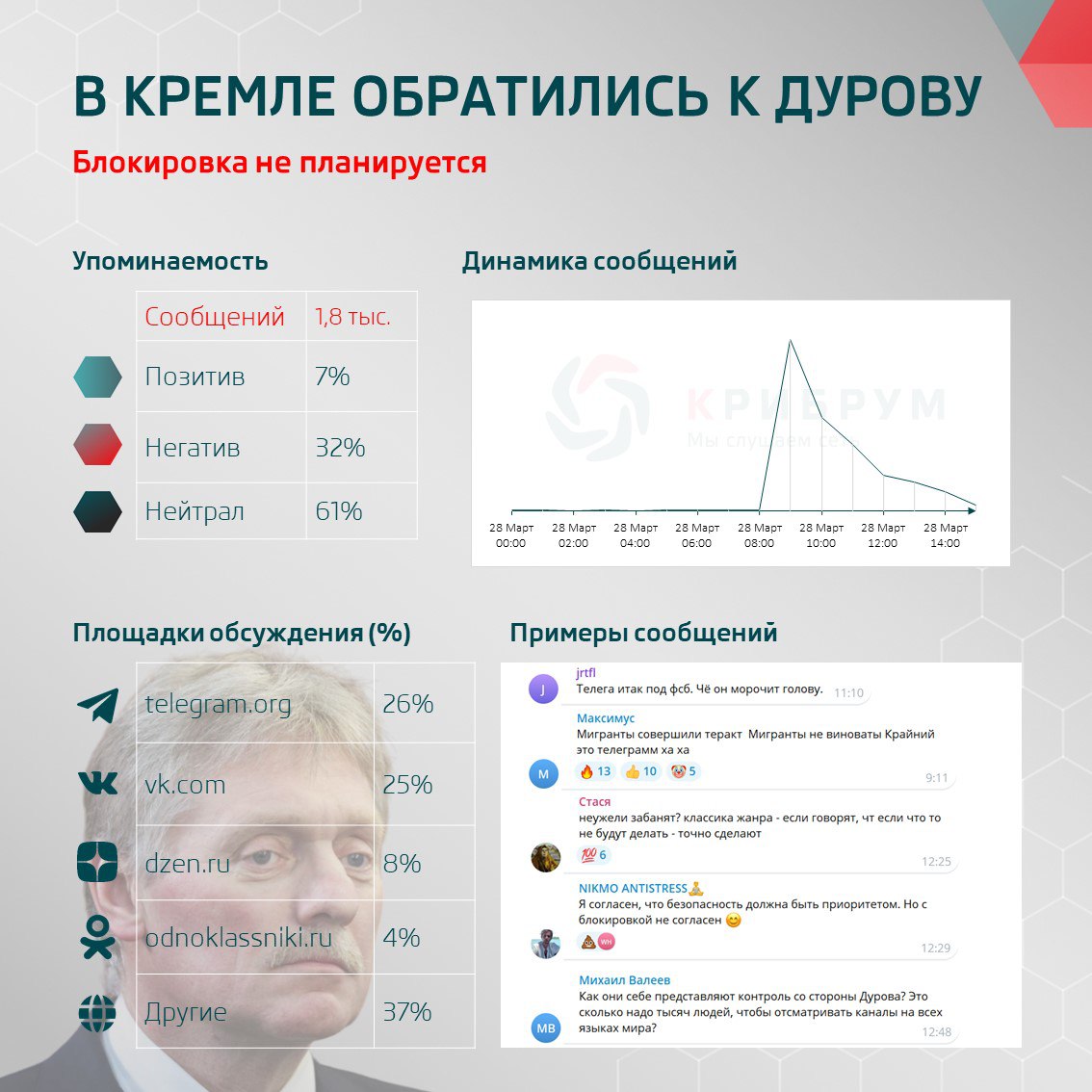 Официальный представитель Кремля Дмитрий Песков призвал основателя Telegram Павла Дурова уделять мессенджеру больше внимания из-за террористов. «Безусловно, мы ожидали бы от Павла Дурова большего внимания, потому что этот уникальный и феноменальный с технологической точки зрения ресурс, который вырос, собственно, на глазах у нашего поколения, все больше становится инструментом в руках террористов — используется в целях террористических», – сказал пресс-секретарь. Песков также подчеркнул, что планов блокировать Telegram в РФ пока нет.