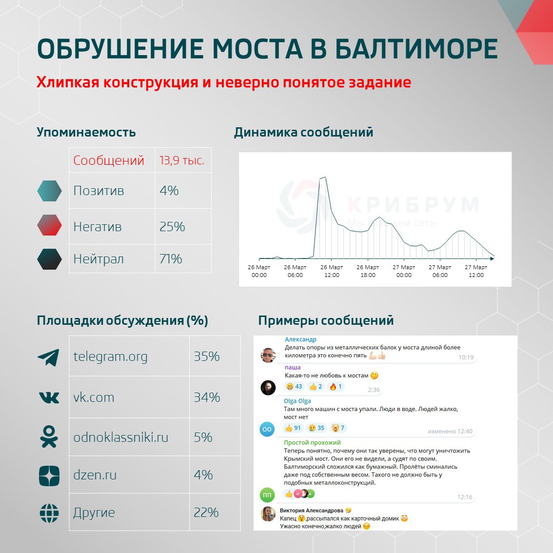 Меньше чем за сутки о нападении было сделано более 20 тысяч сообщений. Тональность публикаций в соцсетях поделилась на позитивную (30%), негативную (31%) и нейтральную (39%).