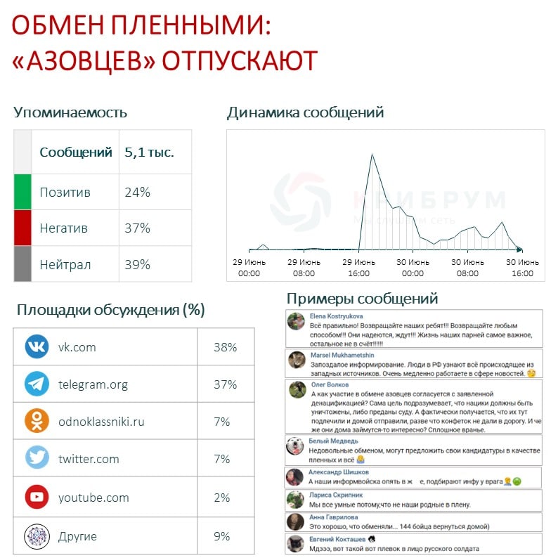 Судебный процесс над наемниками начался седьмого июня. С начала судебных слушаний в социальных медиа было опубликовано более 28 тысяч сообщений, посвященных процессу. Большинство авторов публикаций не выразило личного отношения к приговору - доля нейтральных сообщений составила 63%. В 35% сообщений высказывается одобрение приговора и понимание решения суда, авторы оставшихся двух процентов сообщений настроены негативно — прежде всего к самой концепции смертной казни. Вопрос, которым задаются многие пользователи — понимают ли британские власти, что договариваться о судьбе осужденных надо не с Киевом, а с Донецком, и для этого придется признать республики Донбасса?