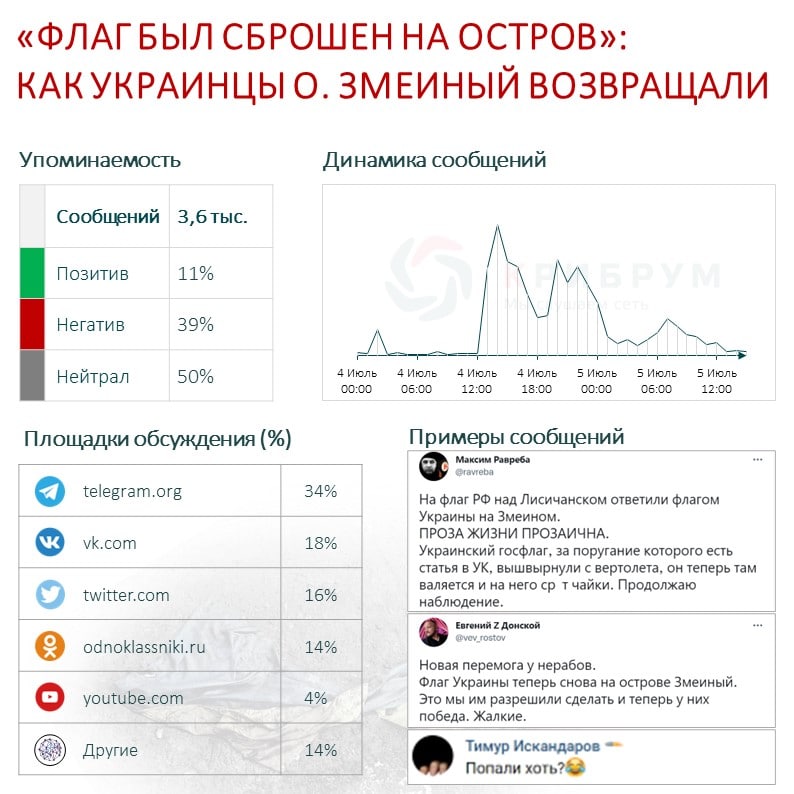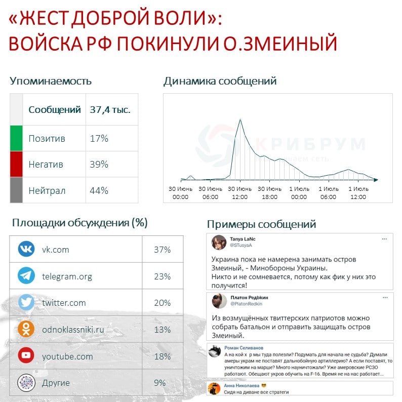 В Сети за сутки число упоминаний острова выросла до 37 тысяч. Тональность упоминаний разделилась на 17% позитивных, 39% негативных и 44% нейтральных. Многие пользователи соцсетей резко негативно отреагировали на решение оставить о.Змеиный. Авторы комментариев не понимают, почему после стольких заявлений о важности контроля острова войска покинули его.