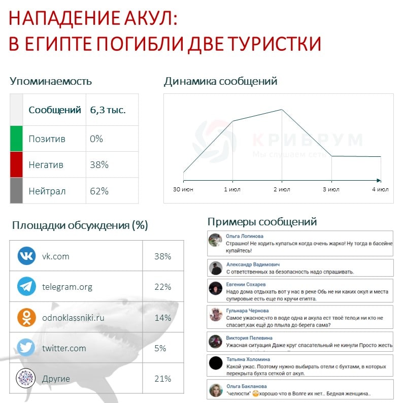 За несколько дней в Сети было опубликовано более 6 тысяч упоминаний инцидента в Египте. Тональность публикаций разделилась между негативными (38%) и нейтральными (62%) сообщениями.