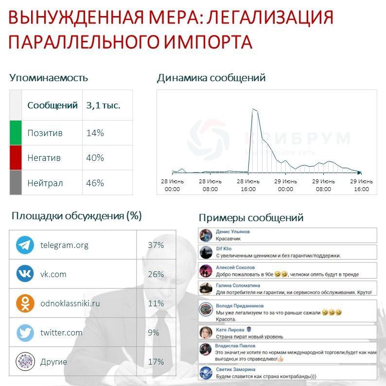 Большинство пользователей соцсетей выразили недовольство легализацией параллельного импорта, назвав эту меру узакониванием контрабандистов. Авторы комментариев, вспоминая слухи о легализации пиратства, считают, что это крайне негативно скажется на репутации страны.