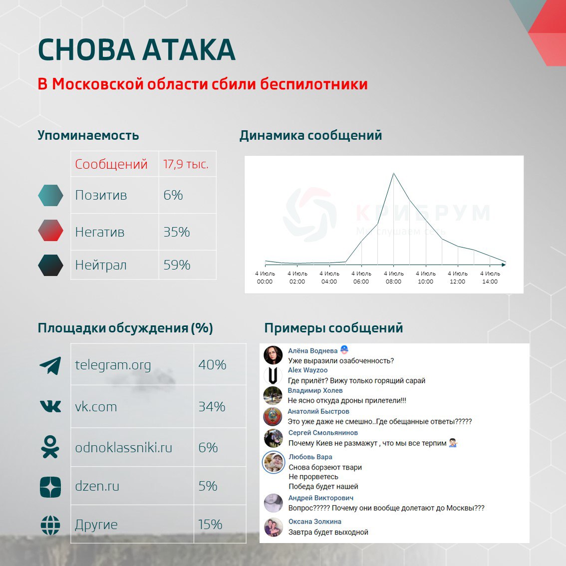 Из-за вбросов немало пользователей скептически отнеслись к официальным заявлениям о происшествии. Многие комментаторы также в очередной раз смутились из-за расстояния, которое удалось преодолеть аппарату после пересечения границы. Авторы возмущаются, что БПЛА был уничтожен только на подступах к столице. В свою очередь те, кто предполагает, что он был запущен где-то в Московской области, возмущаются тем, что кому-то это снова удалось.