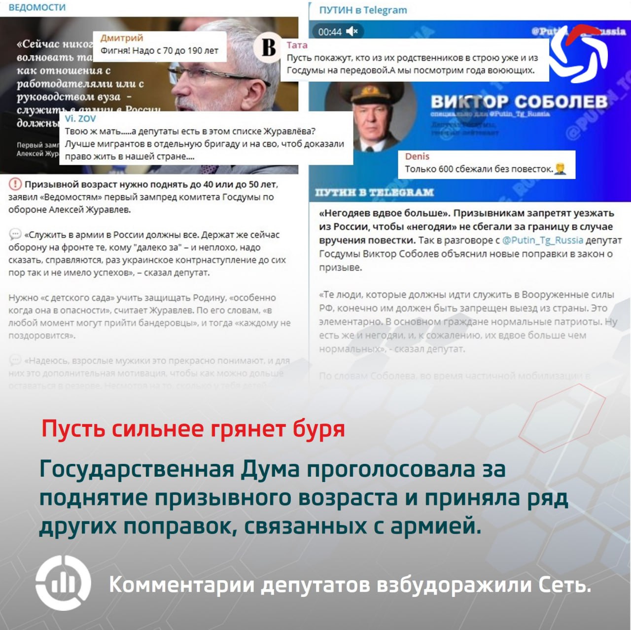 Среди прочих, комментируя поправки о запрете выезда призывникам и мобилизованным, высказался депутат Соболев (КПРФ). Его слова немедленно растиражировали соцсети: