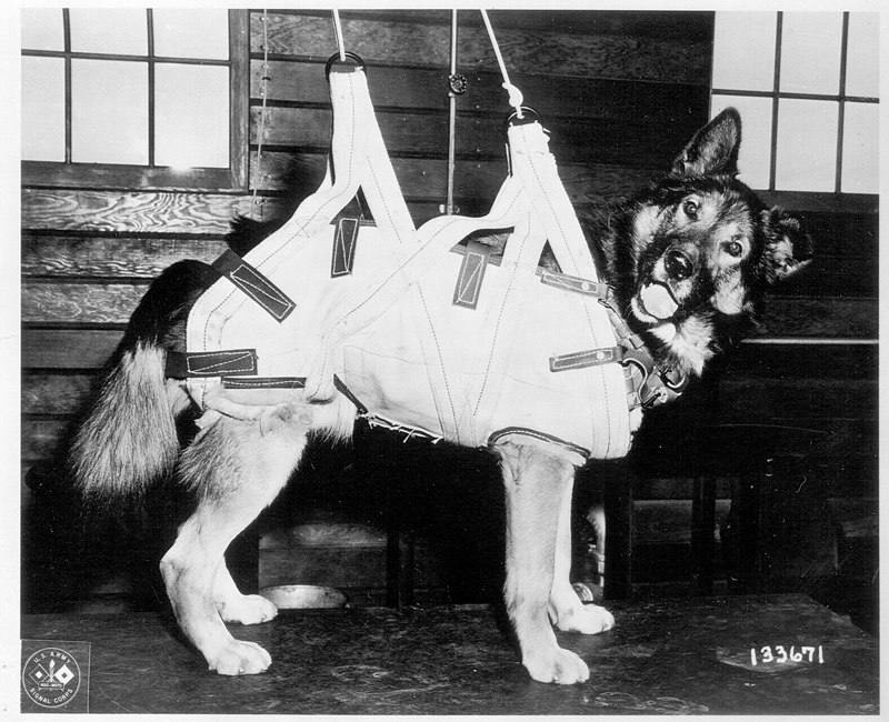 Кстати, это еще британская армия в ходе подготовки к высадке в Нормандии начала эксперимент по тренировке собак-парашютистов. Собаки-десантники должны были искать мины и предупреждать о приближении врага.
