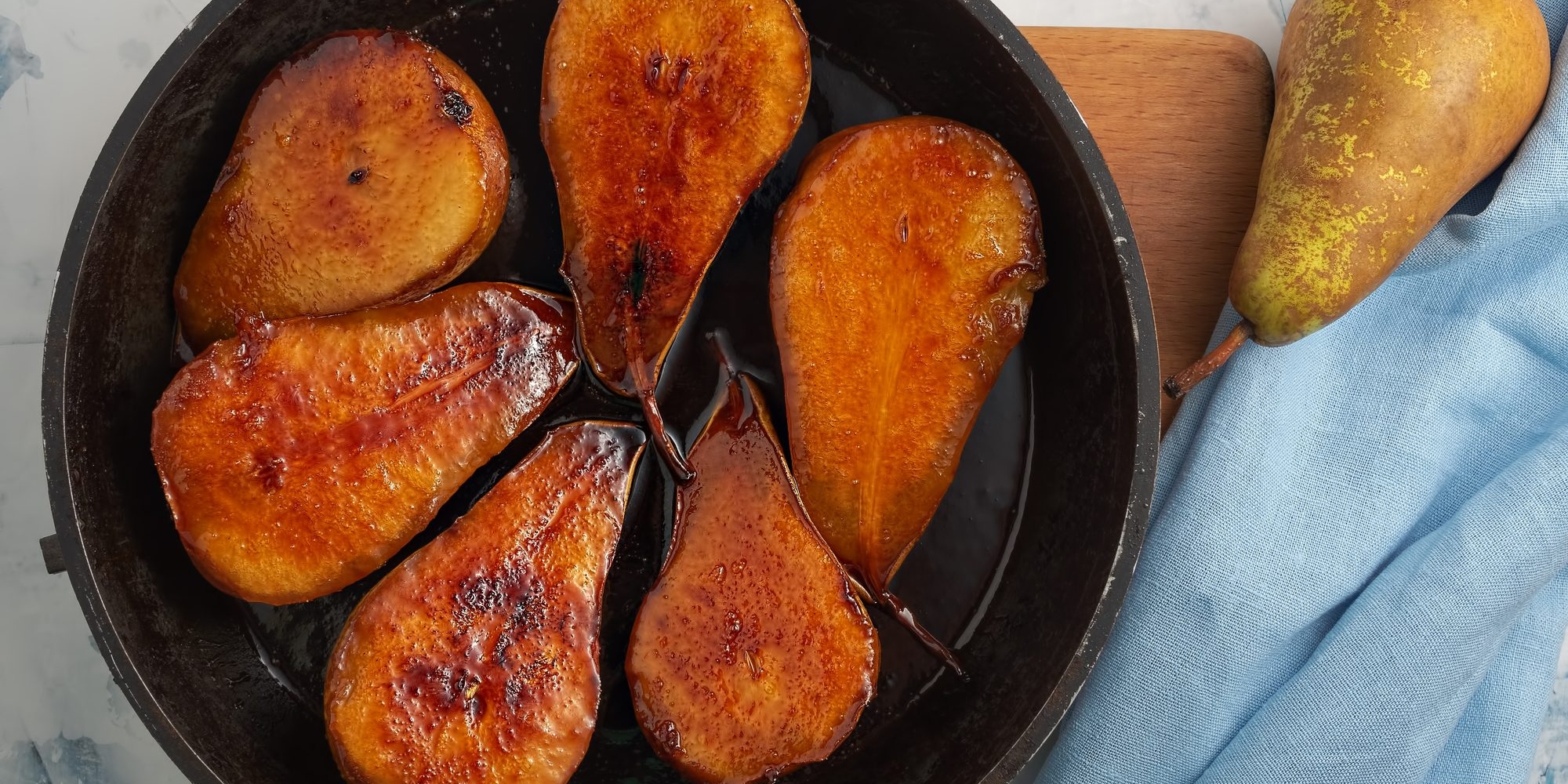 Переверните груши, полейте соусом со дна сковороды и жарьте ещё примерно 5 минут."