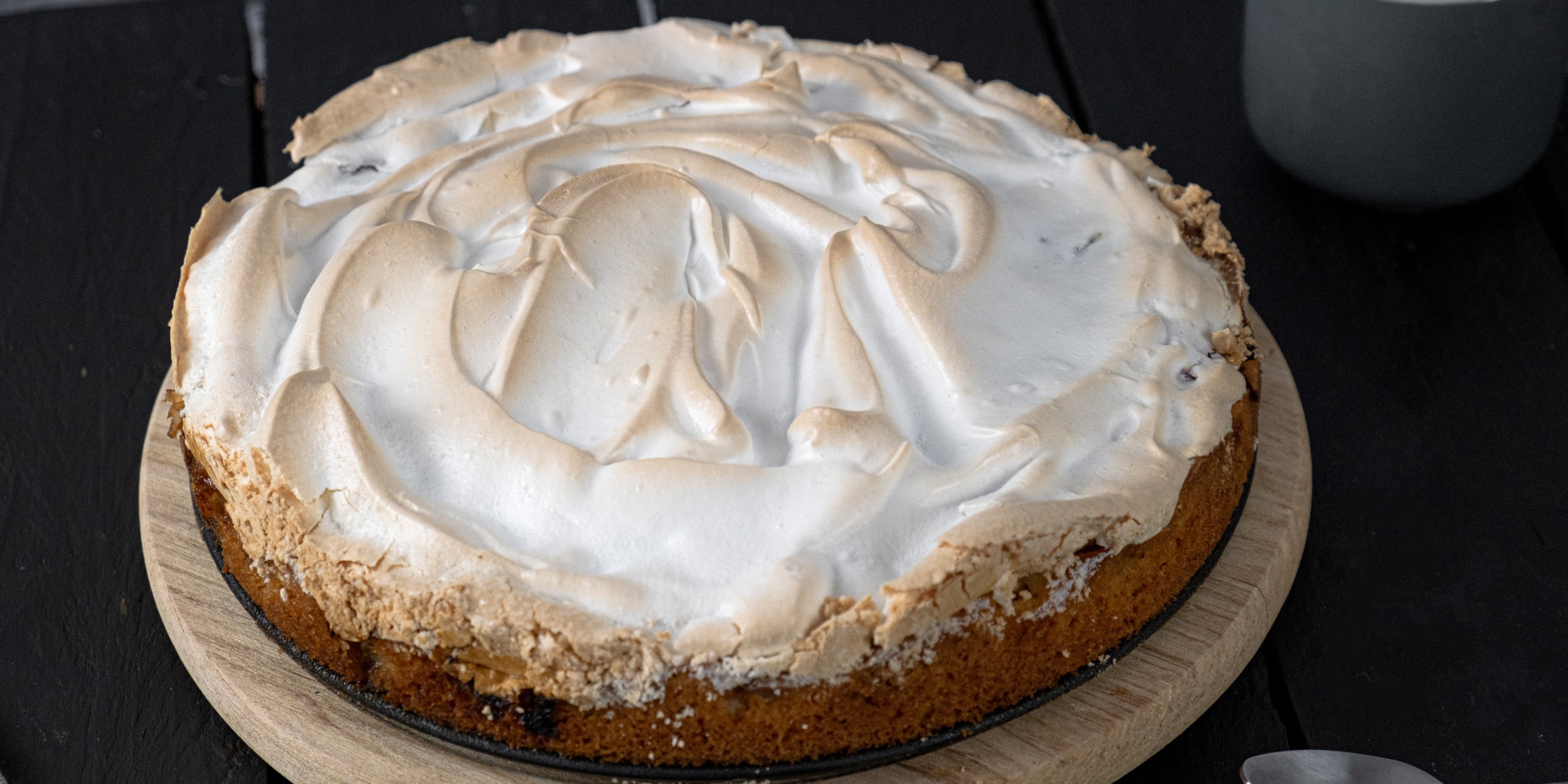 Выньте пирог из духовки. Снизьте температуру до 150 ℃. Красиво распределите взбитые белки по тесту с помощью ложки или кондитерского мешка.