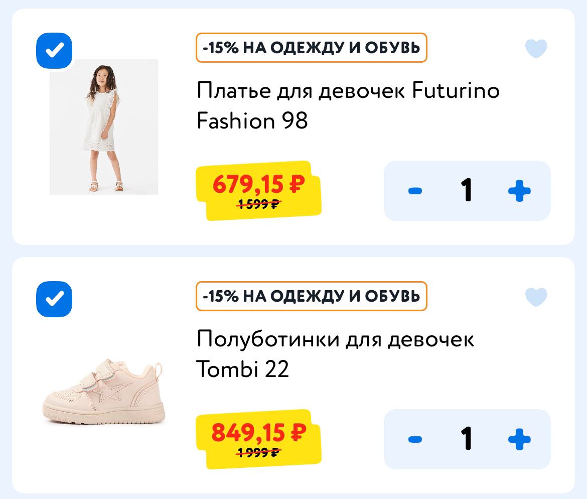 дополнительная СКИДКА 15% в корзине на детскую и женскую одежду и обувь