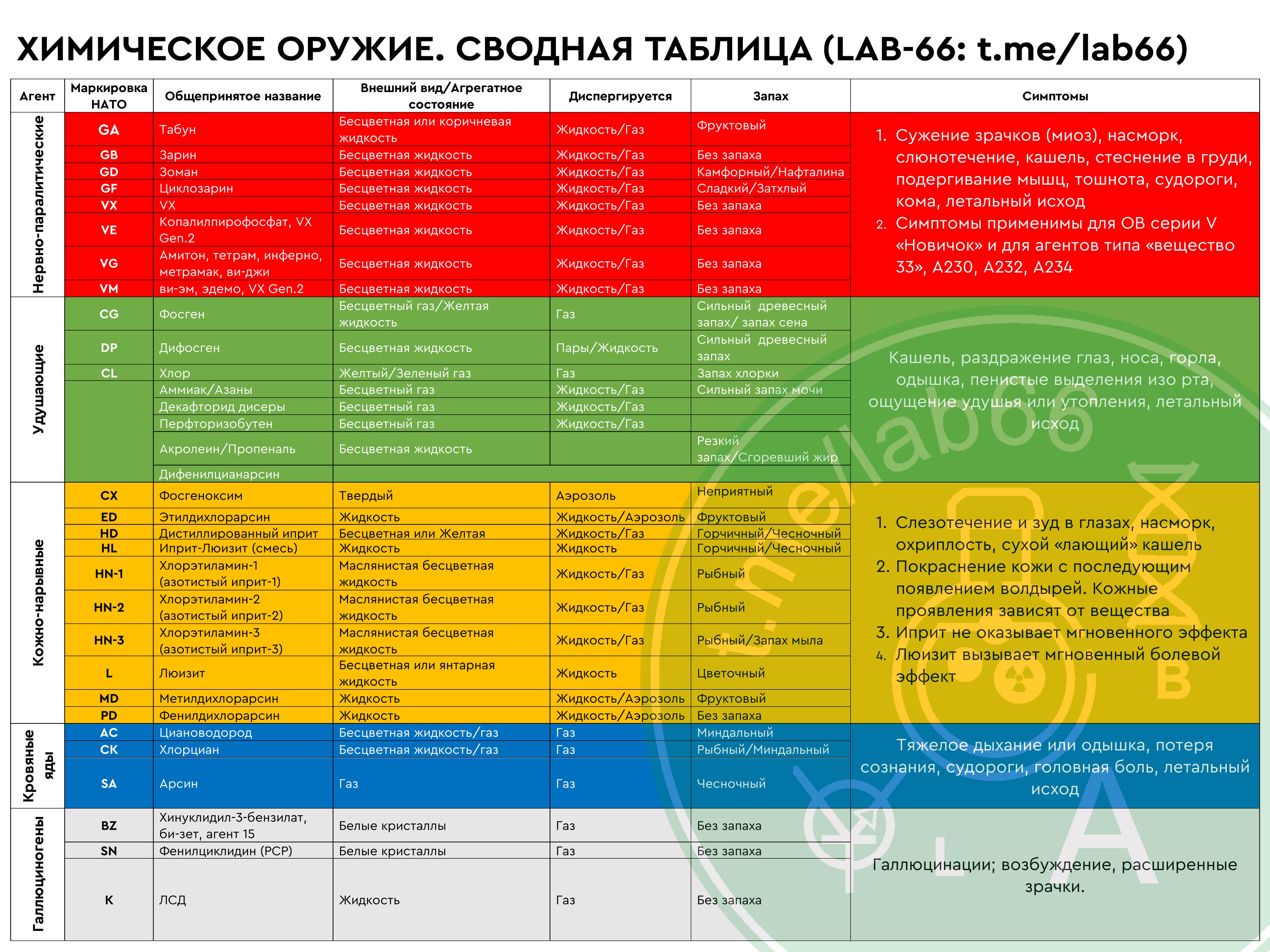 Но раз таковой инфоповод возник - прикрепляю сводную таблицу химического оружия с описаниями симптомов и агрегатных состояний. Такую таблицу использует Интерпол. В некоторых случаях она может помочь провести первичную идентификацию непонятного отравляющего вещества (а значит и подсказать тактику действий).