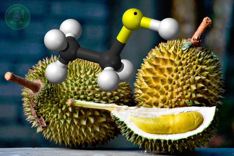 Про то, почему дурианы вкусны писать не интересно, а вот про то, почему воняют можно. В составе летучих соединений этого растения идентифицируется достаточно много компонентов. В эфирном масле превалирует этил-2-метилбутаноат, как ни покажется странным, но это вещества активно используется в пищевой промышленности в качестве ароматизатора с запахом зеленых яблок или что-то подобное фруктовое. Но ложка дегтя портит бочку меда, вот и здесь микроколичества таких веществ как меркаптаны сводят на нет все фруктовые запахи.