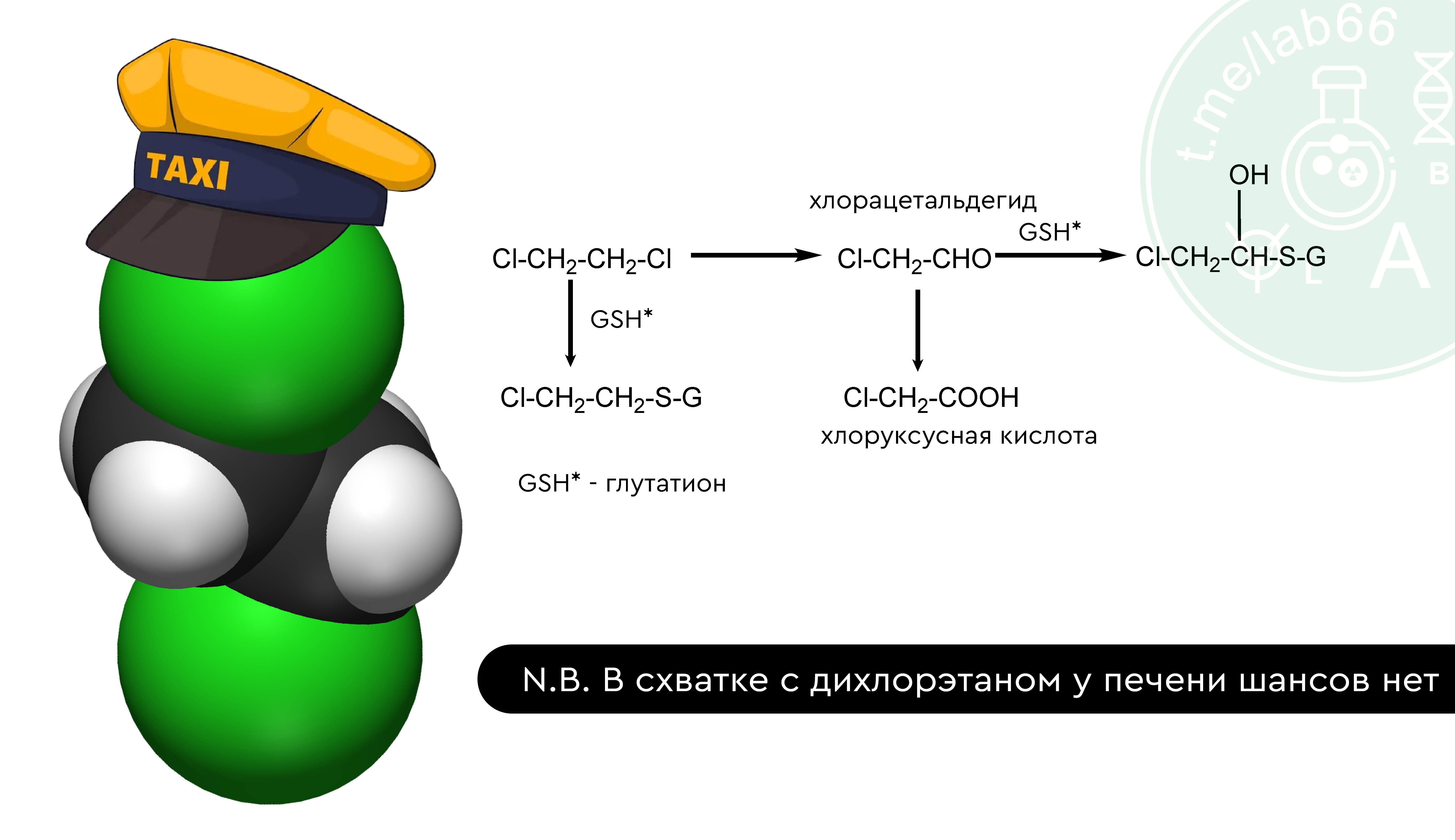ДХЭ после попадания в желудочно-кишечный тракт абсорбируется быстро и полностью. Метаболизм проходит по двух конкурирующим путям - либо через окисление цитохрома Р-450, либо через прямую коньюгацию с глутатионом (на картинке). Многие из метаболитов, которые получаются в результате гораздо токсичнее чем сам ДХЭ и являются очень активными соединениями. Пару примеров того, что образуется - хлорацетальдегид, ацетилхлорид, хлоруксусная кислота, тиодигликолевая кислота, сульфоксид тиодиогликолевой кислоты. Шансов у организма, гепатоцитов, да и вообще биологических тканей никаких, к сожалению. Только разрушение, настолько быстрое, насколько велик объем ДХЭ, попавший в ЖКТ.
